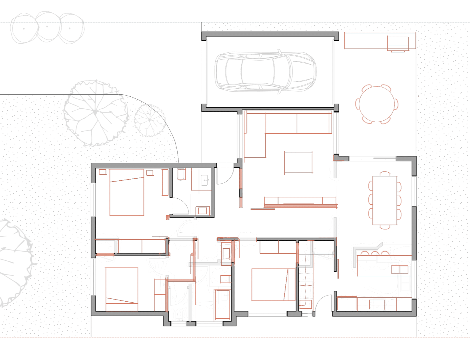 Option 3 (Final Plan): Extension of the existing home to the rear to significantly increase the Kitchen Living zone and provide a larger outdoor entertaining space. As well as also refining the remaining front portion of the home.